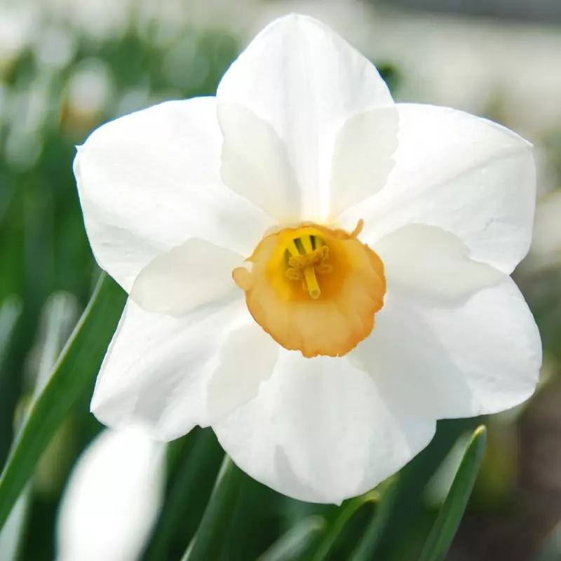 Opis: Narcisa z belimi cvetovi in izrazito rožnato-oranžno čašico.