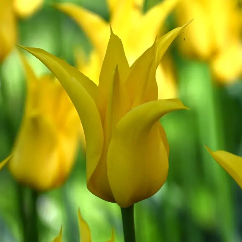 Opis: Tulipan z živimi rumeni lilijasti cvetovi.