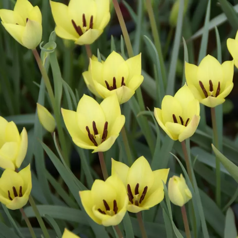 Opis: Botanični tulipan z nežno rumenimi cvetovi z nekaj rožnatega pridiha na zunanji strani cveta.