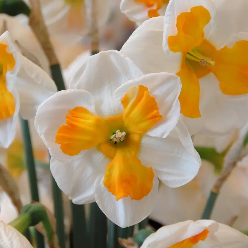 Opis: Narcisa z zanimivimi belimi cvetovi in na tri dele predeljeno korolo.