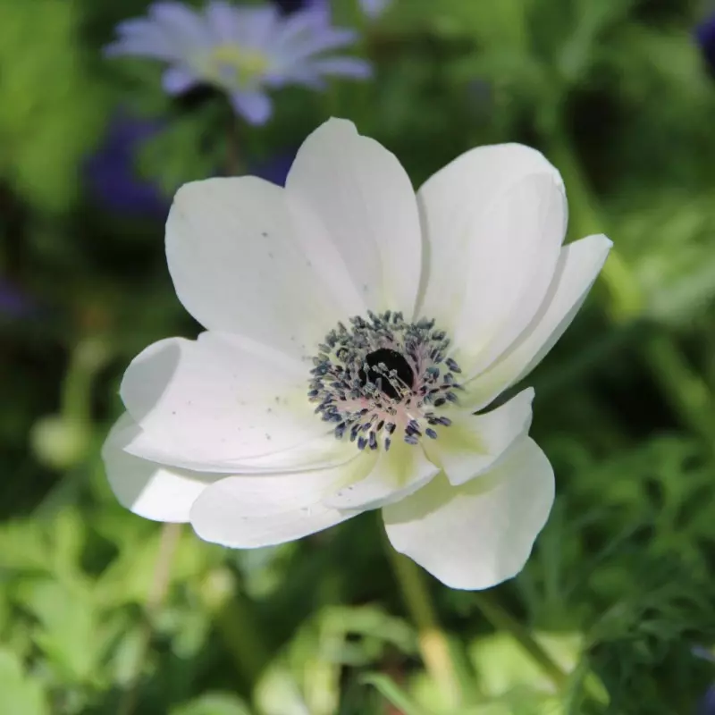 Opis: Čudovit kultivar vetrnic z belimi cvetovi in vijoličasto sredino.