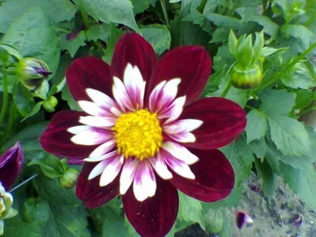 Opis: Dalija s temno rdečimi cvetovi in svetlejšimi ovratnikov. Velikost cvetov je 7-8cm.