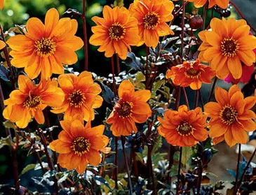Opis: Dalija s pol-polnimi temno oranžnimi cvetovi in temnimi listi.