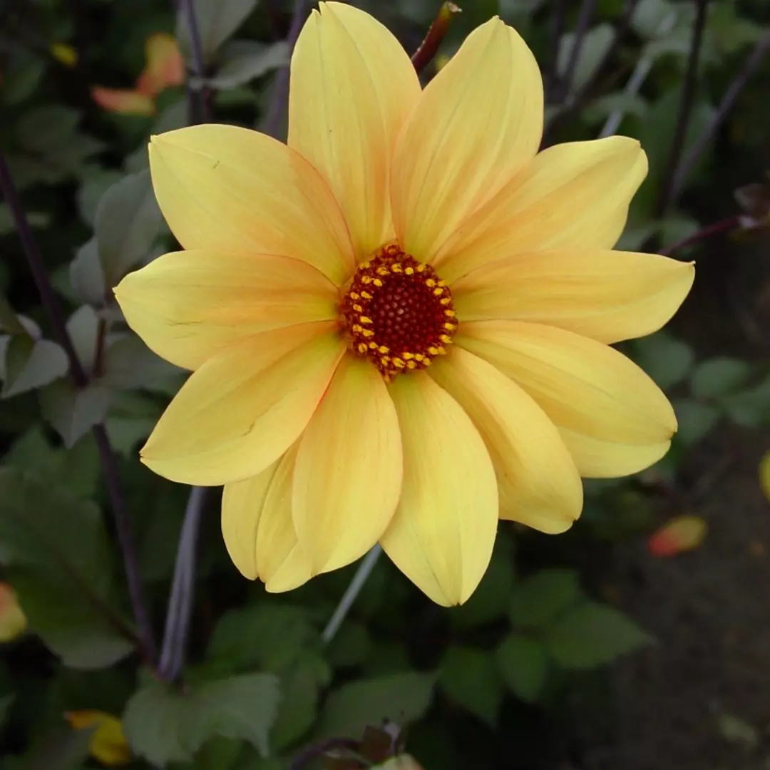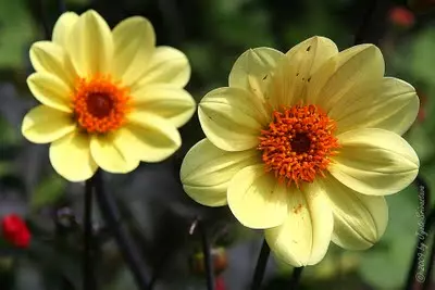 Opis: Dalija z zelo temnimi listi in svet oranžnimi polpolnimi cvetovi.