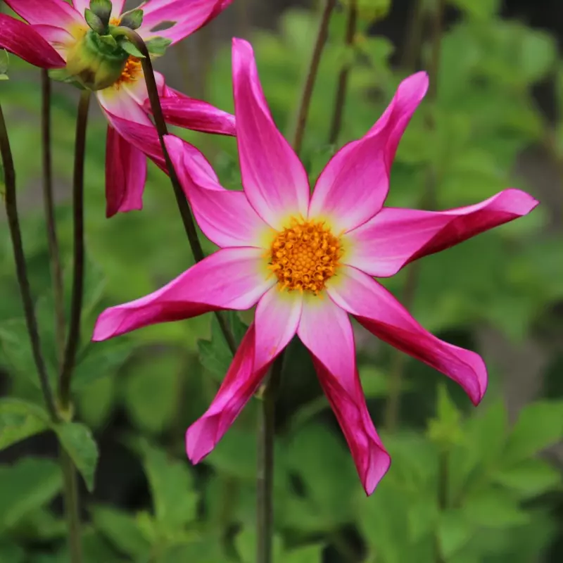 Opis: Dalija z enojnimi rožnatimi zvezdastimi cvetovi. Cvetovi imajo 10cm premera.