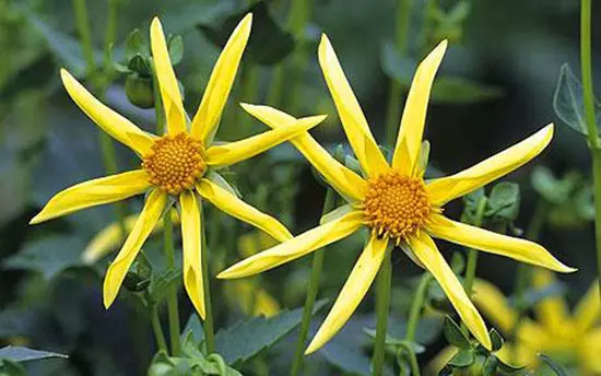Opis: Dalija z zvezdastimi rumenimi cvetovi. Premer cveta je 10cm.