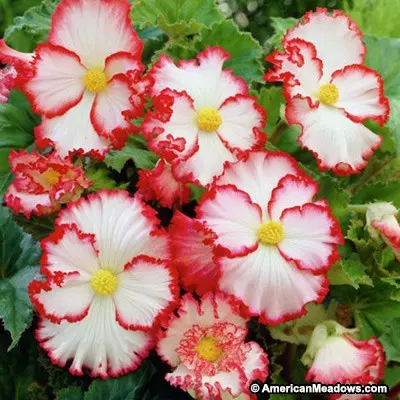 Opis: Begonija polnimi ali polpolnimi belimi cvetovi z resičastim rožnatimi robom.