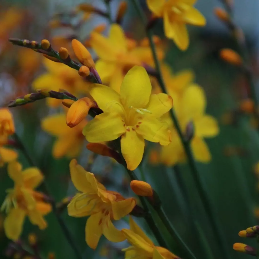 Opis: Montbrecija z okrasto rumenimi cvetovi v rdečo pego na sredini.
