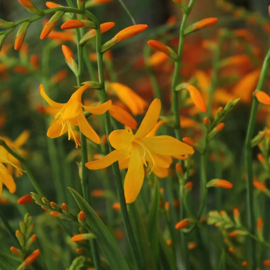 Opis: Montbrecija z nekoliko manjšimi zlato rumenimi cvetovi.