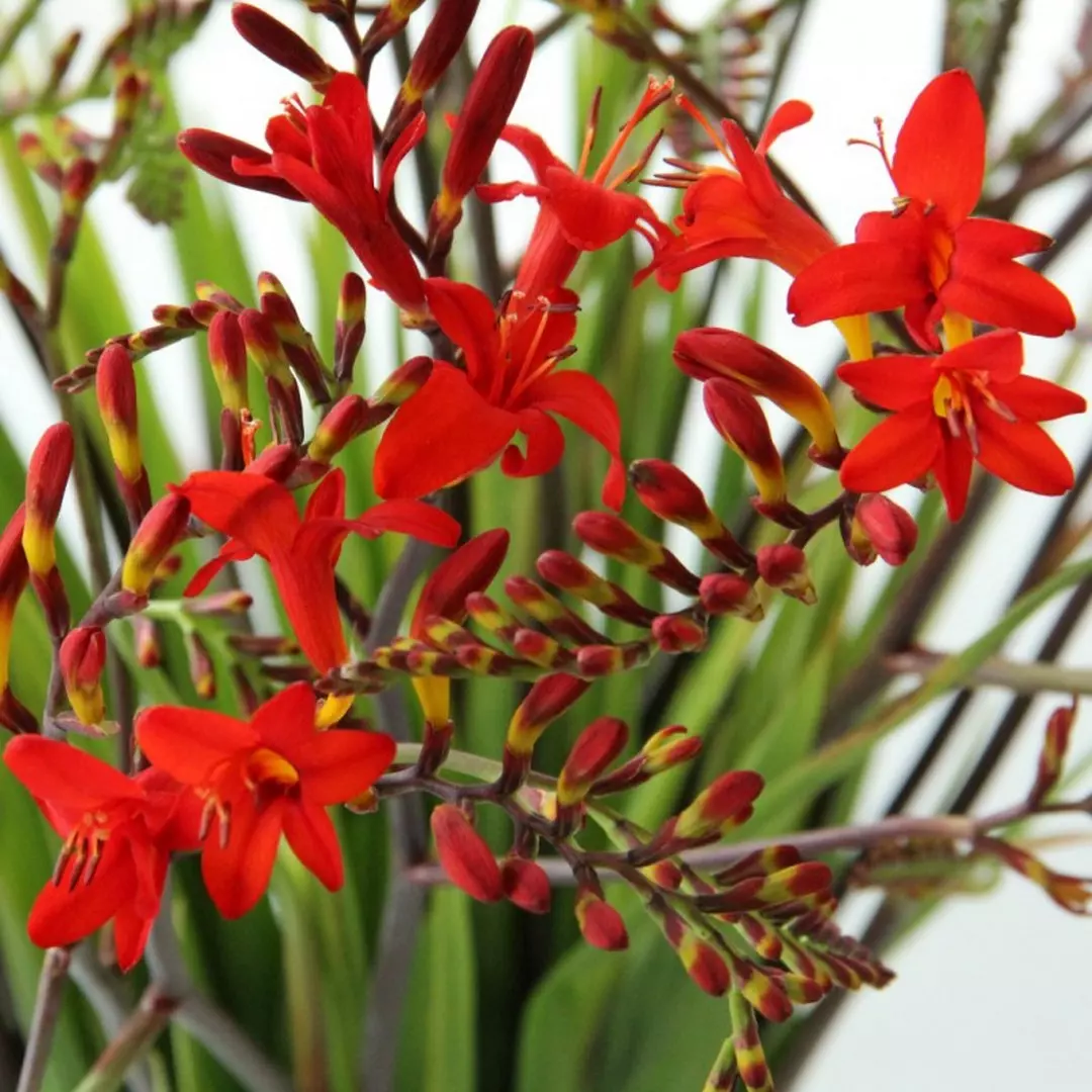 Opis: Montbrecija z izredno živo rde?imi cvetovi.