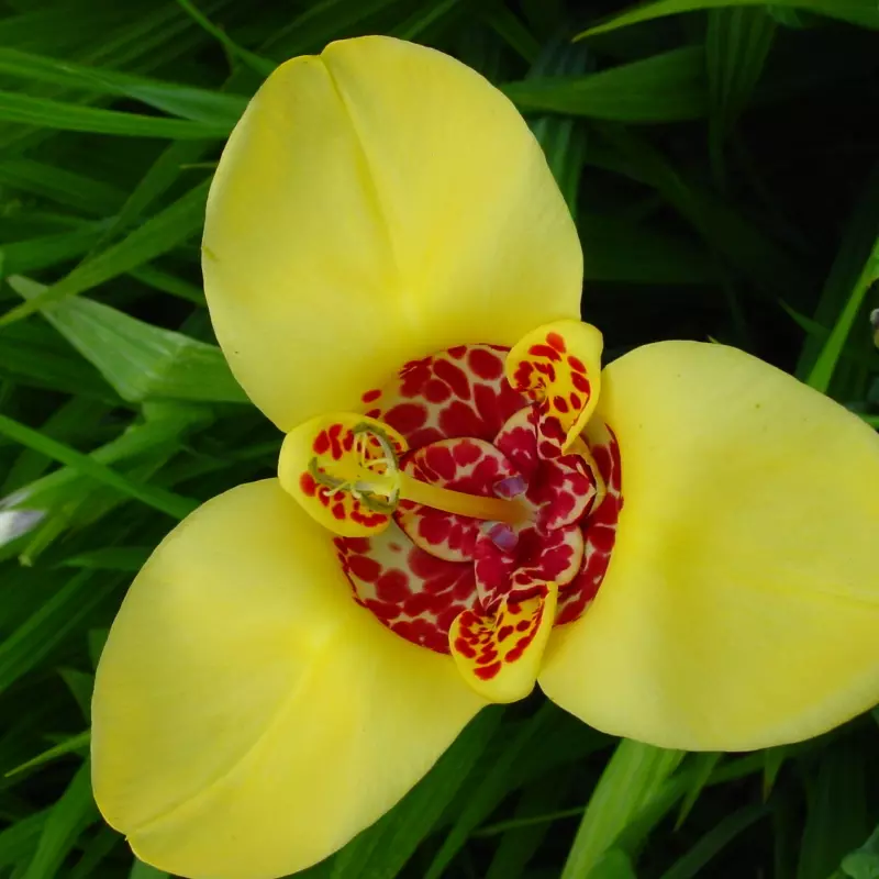 Opis: Tigridija z zlato rumenimi cvetovi z rdečo sredino.