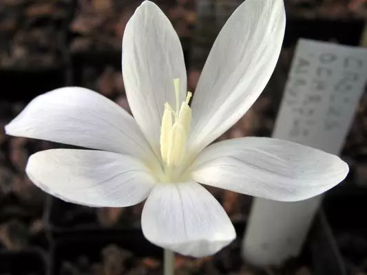 Opis: Jeseni cvetoč žafran z majhnimi belimi cvetovi.