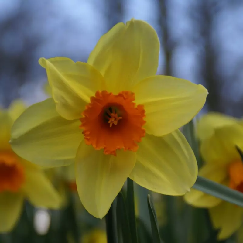Opis: Narcisa z rumenimi cvetovi in oranžno rdečkasto čašo.