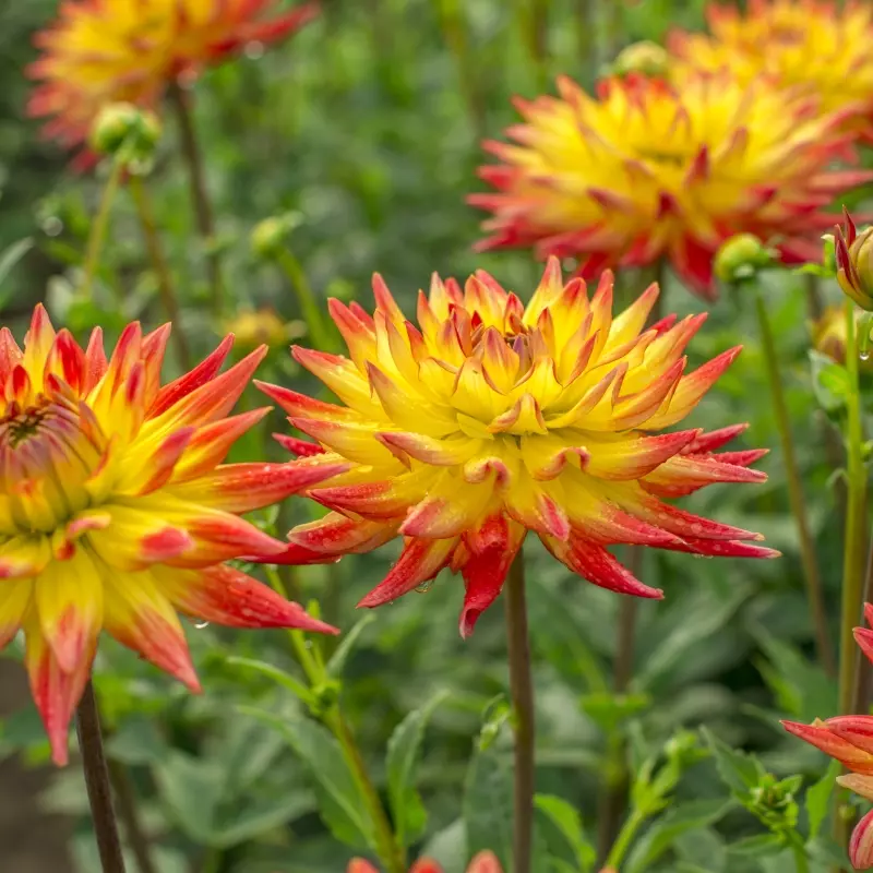 Opis: Dalija z rumenimi cvetovi in rdečkastimi konicami.