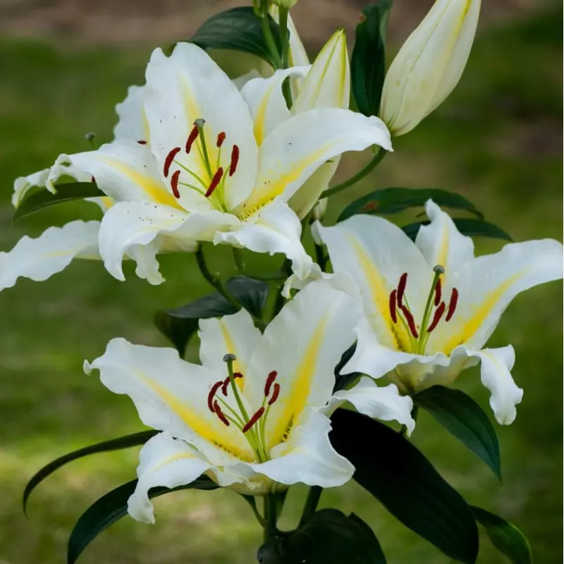 Opis: Čudovita orientalska lilija z belimi cvetovi z rumenimi progami na sredini. Prijetno dišeči cvetovi.