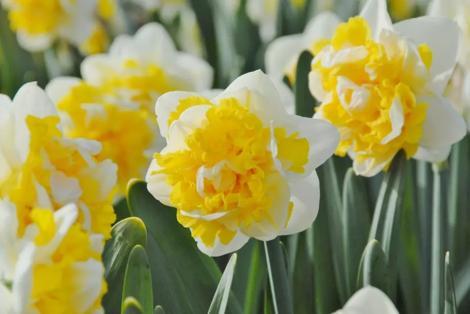 Opis: Narcisa z belimi cvetovi in rumeno polno sredino cveta.
