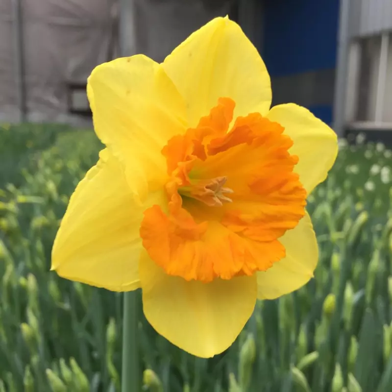 Opis: Čašasta narcisa z rumenimi cvetovi in prekrasno oranžno čašico, ki spominja na krono.