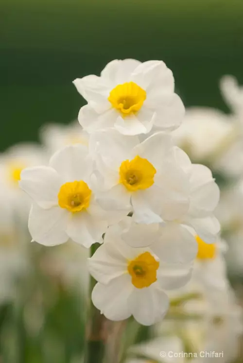 Opis: Prekrasna narcisa z belimi cvetovi in majhno rumeno čašo. Požene 4-7 cvetov na steblo. Prijetno dišeča.