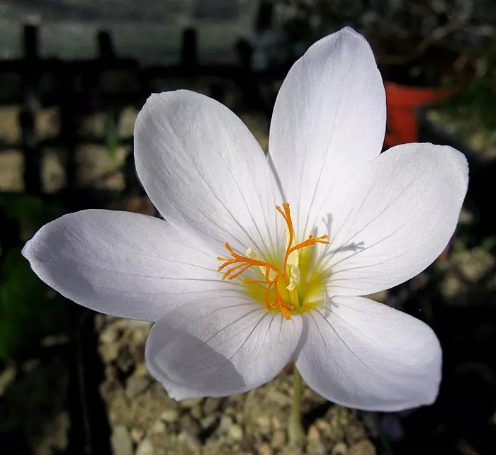 Opis: Jeseni cvetoč. žafran z belo-sivimi cvetovi z belo notranjostjo.