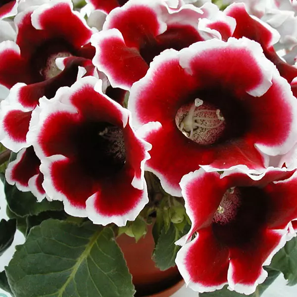 Opis: Č.udovita gloksinija z rdeč.imi cvetovi z belo obrobo.