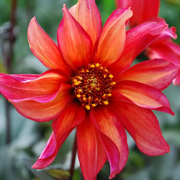 Opis: Dalija s polpolnimi cvetovi obarvanimi v rdečo barvo z nekaj rumenega pridiha. Cvetovi dosežejo premer do 11cm.