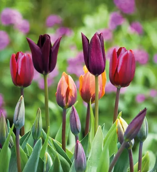 Opis: Čudovita kombinacija v žametno škrlatnih odtenkih popestrenih z oranžno barvo. Združuje zgodnje tulipane in tulipane iz skupine Triumph. Vsaka sorta je v svoji vrečki, tako da se lahko sami odločite, kako jih boste kombinirali na gredi.