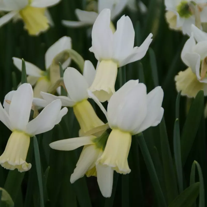 Opis: Zgodaj cvetoča narcisa z belimi cvetovi in podaljšano nežno rumenkasto trobentico.