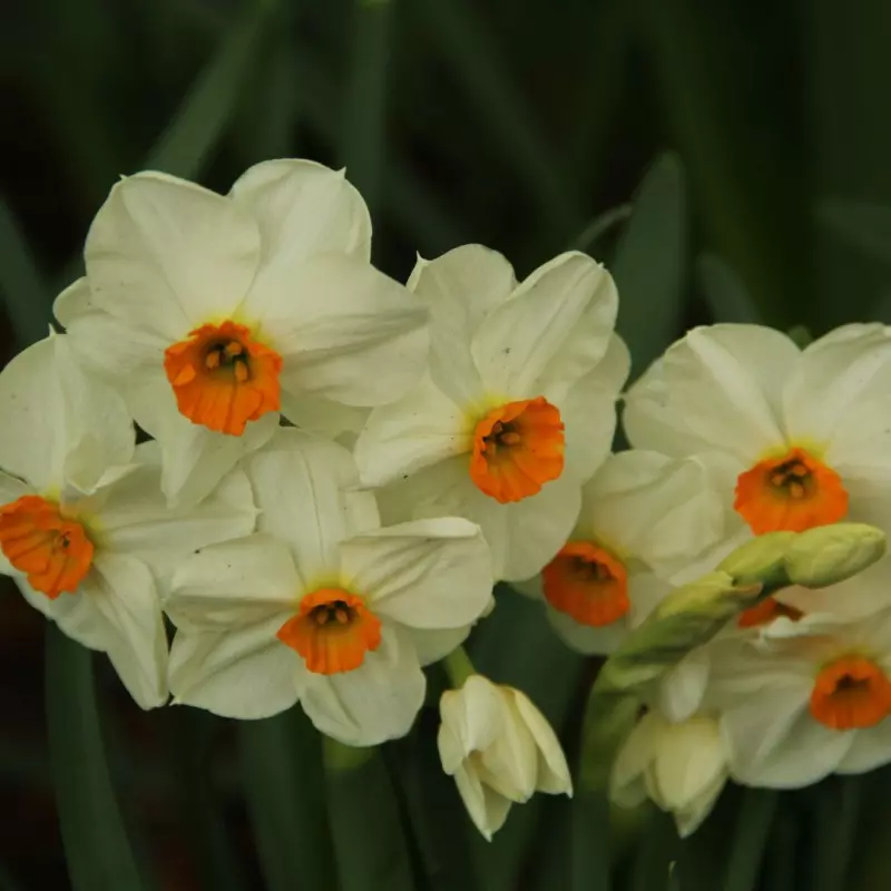 Opis: Prekrasna narcisa z belimi cvetovi in majhno oranžno čašo. Prijetno dišeča.