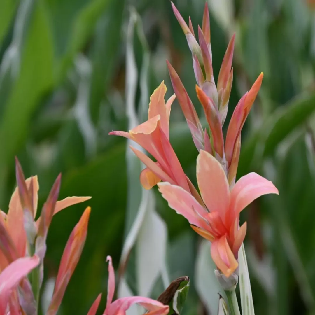 Opis: Nenavadna kana z nežno oranžno-rožnatimi cvetovi. Listi so sivkasto-zeleni z debelimi belimi progami.