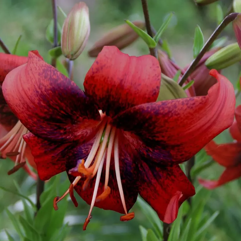 Opis: Tigrasta lilija s cvetovi v jagodni barvi in temnimi pegami.