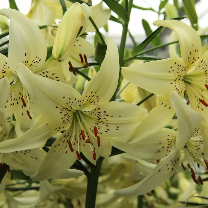 Opis: Tigrasta lilija z belimi cvetovi z veliko temnimi pegami.