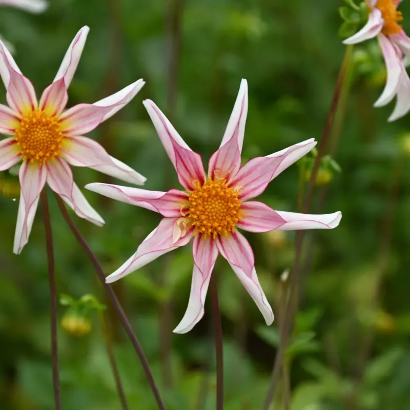 Opis: Dalija z belimi zvezdastimi cvetovi z nekaj rožnato-rdečega pridiha. Velikost cvetov je 10cm.