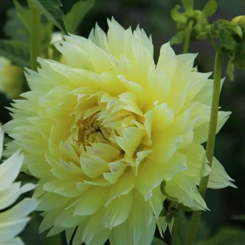 Opis: Dalija z resičastimi cvetovi v nežno rumeni barvi. Cvetovi zrastejo do 11cm premera.