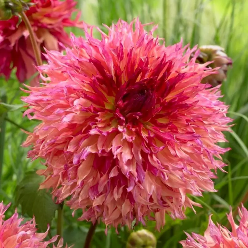 Opis: Dalija z resičastimi cvetovi v odtenkih rožnate, lososove in vijoličaste barve. Velikost cvetov je 15-20cm.