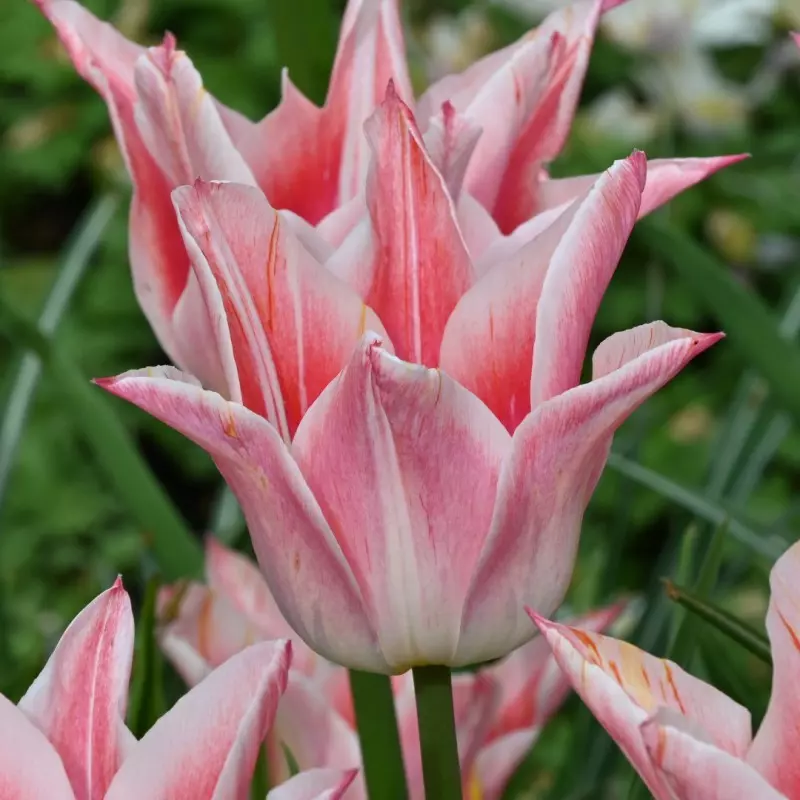 Opis: Lilijast tulipan z nežnimi rožnatimi cvetovi z belim robom.