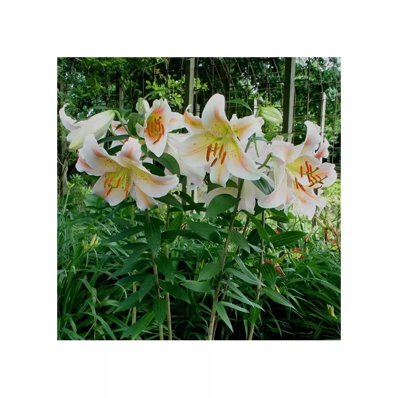 Opis: Prekrasna orientalska lilija z belimi cvetovi z nekaj pridiha v lososovi barvi.