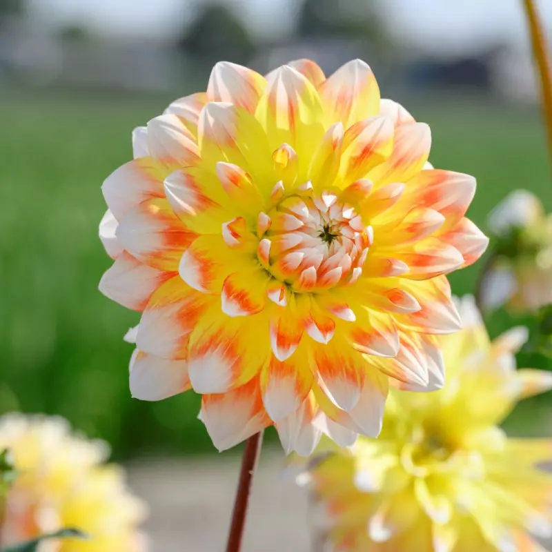 Opis: Dalija s cvetovi v rumeni in oranžni barvi ter belimi konicami. Velikost cvetov je 13cm.