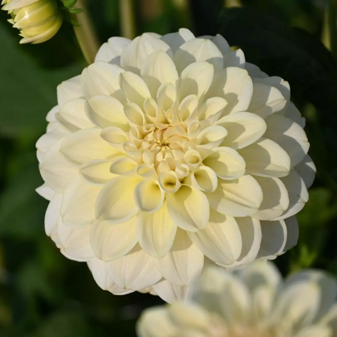 Opis: Dalija s kremastimi cvetovi, ki prehajajo v nežno rumeno. Velikost cvetov je 10cm.