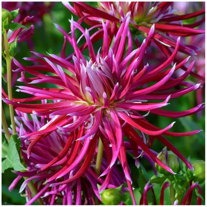 Opis: Kaktus dalija s temnimi škrlatnimi cvetovi z belimi konicami. Velikost cveta je 20cm.