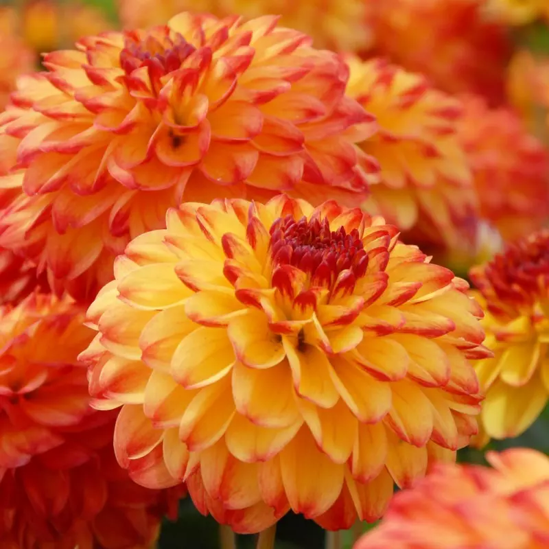 Opis: Dalija s cvetovi v rumenih in bronasto-rdečih odtenkih. Velikost cvetov je 10cm.