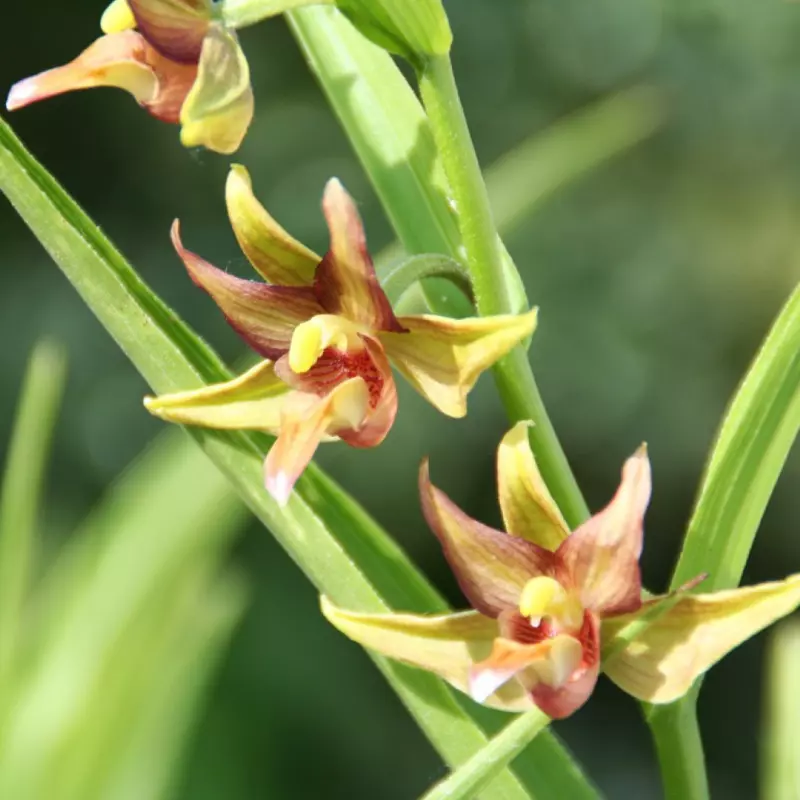 Opis: Pokončna orhideja z zelenkasto-oranžnimi cvetovi.
