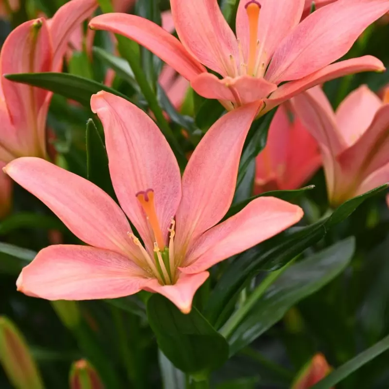 Opis: Čudovita azijska lilija z nekoliko manjšimi cvetovi v oranžno-rožnatih tonih.