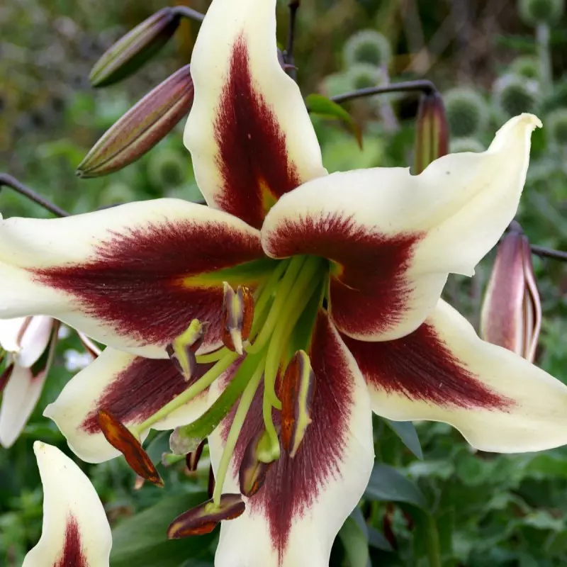 Opis: Čudovita lilija z belimi cvetovi z vinsko rdečo sredino cveta.