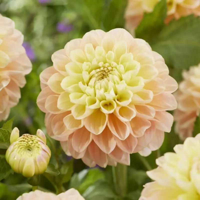 Opis: Dekorativna dalija s cvetovi v mareličasto-rumenih odtenkih. Velikost cvetov je 12cm.