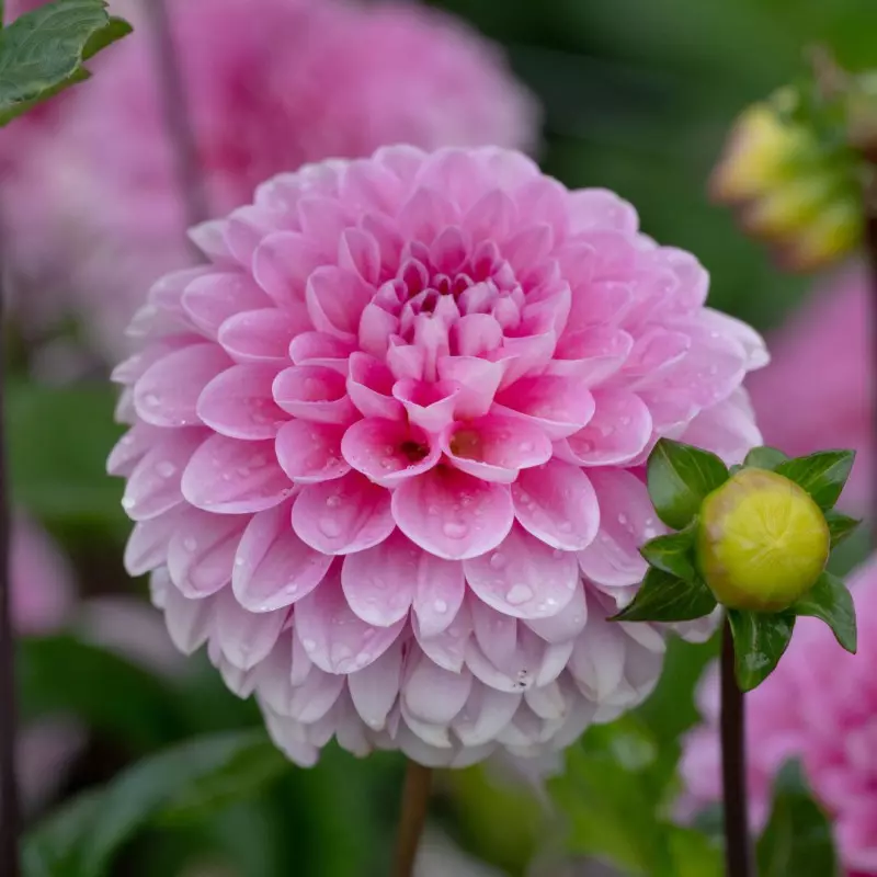 Opis: Dalija s kroglastimi cvetovi v rožnatih odtenkih. Cvetovi so veliki 8cm.