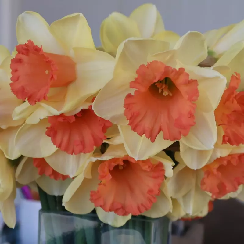 Opis: Trobentasta narcisa s pastelno rumenkastimi cvetovi in intenzivno oranžno trobentico.
