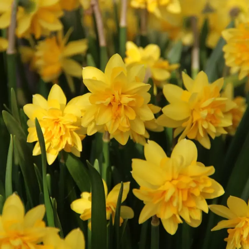 Opis: Nizka narcisa z intenzivno rumenimi polnimi cvetovi.