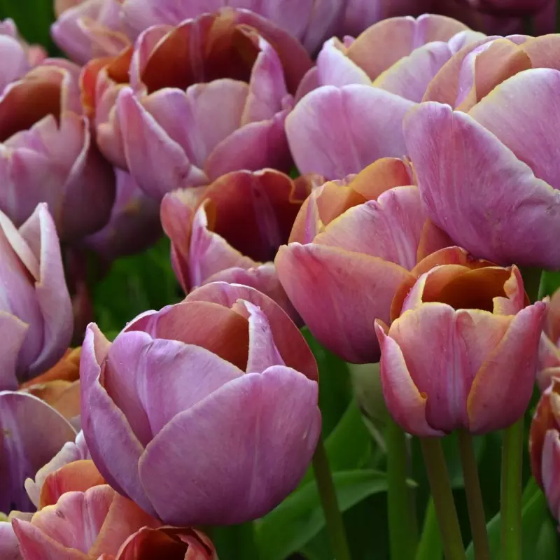 Opis: Čudovit večstebelni tulipan. Cvetovi se odprejo obarvani v bronaste odtenke, ki počasi preidejo v nežno rožnat-vijolično barvo.