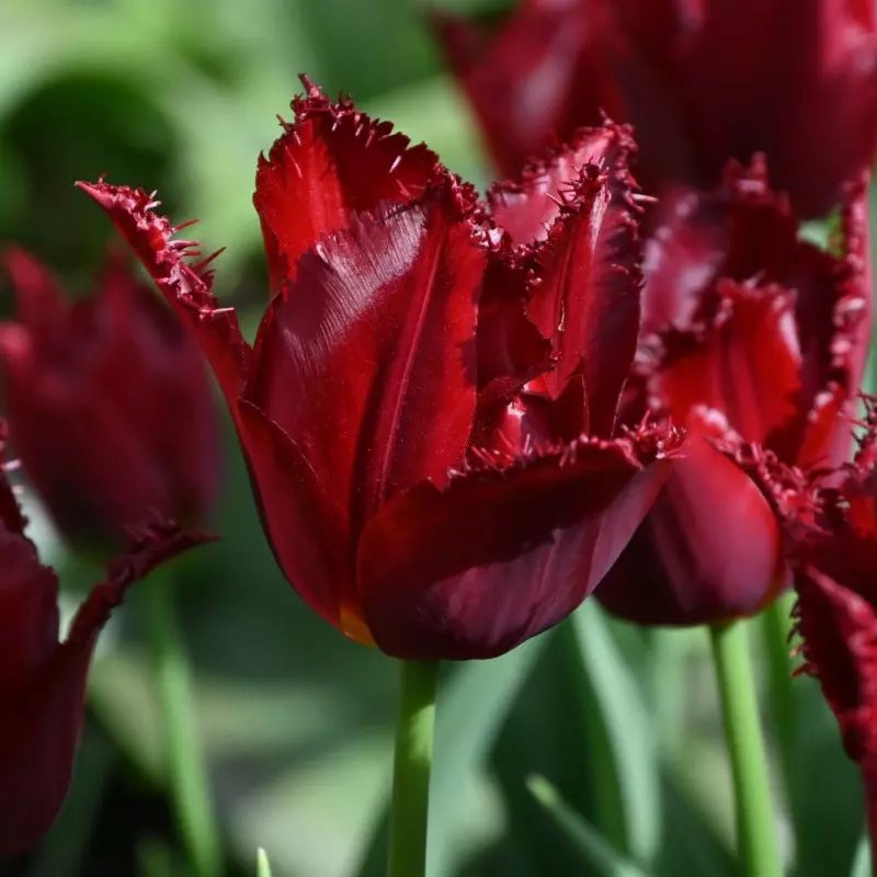 Opis: Tulipan z resičastimi cvetovi v borgundsko rdeči barvi.