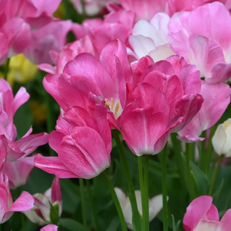Opis: Mnogocvetni tulipan s cvetovi v kombinaciji nežno rožnate in rožnato-rdeče barve.
